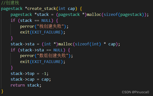 接着是创建栈函数,接受一个设置栈容量的参数,和创建队列函数一样,先为栈分配内存,然后为数组分配内存,top初始化为-1,容量按传入的参数设置