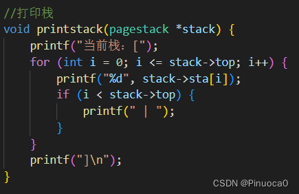 之后是打印栈函数,每次进行页面置换,调入内存等都要将操作后的栈内容打印出来,和队列打印一样,遍历整个栈,页面之间用|分开