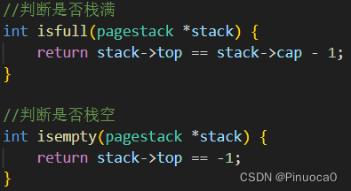 接着是判断栈满和占空,因为数组是从0开始,所以当top顶部等于容量cap-1时就说明栈满了,如果top为0说明有一个元素,如果top为-1,说明栈空了。