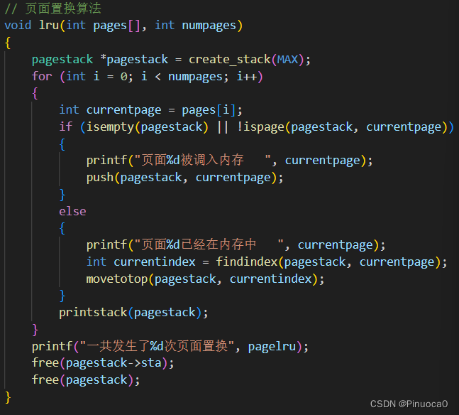 之后就是页面置换算法,lru函数接受两个参数,一个是数组,一个是该数组中元素个数,先用函数创建一个栈,然后遍历整个数组,用currentpage来存储当前遍历到的页面,如果栈空,就直接将页面调入内存,如果栈非空,但是页面不在内存中,也是将页面调入内存,如果栈非空,但是页面在内存中,就要将页面调到栈顶。如果将页面调入内存中时如果栈非空但不满,就将页面调入栈中,如果栈满,就需要进行页面置换,将栈顶调出来,将页面调入栈顶。设置一个全局变量记录页面置换次数。最后释放栈和数组。