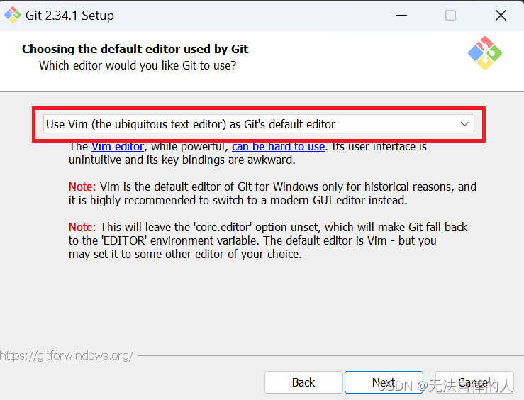 ②将GItBash添加到Windows terminal中,建议勾选。- 选择一个默认的编辑器,默认为Vim(Linux的),里面还有Notepad,我选择使用Vim。