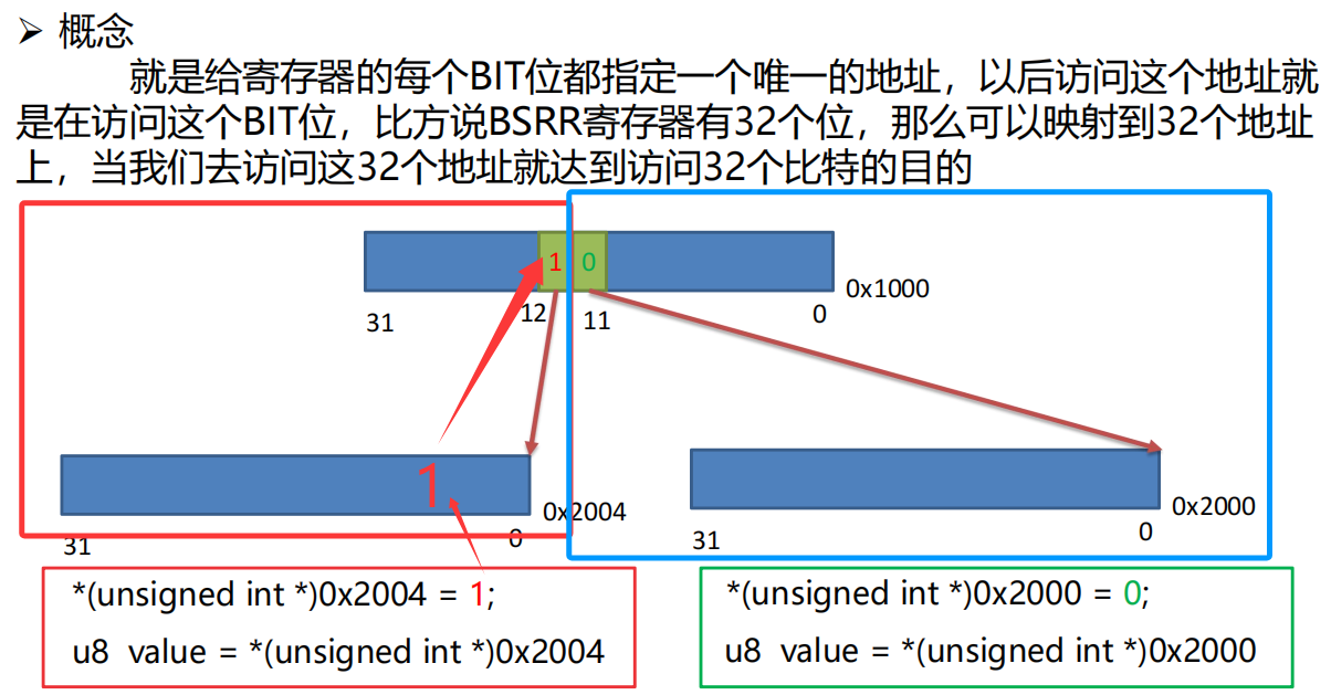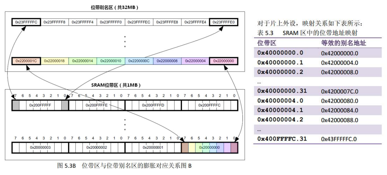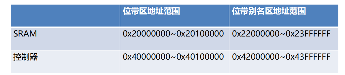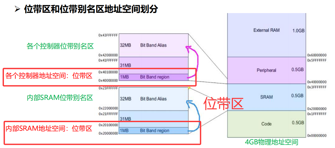 1bit和4字节做映射,那么1MB就和32MB做映射,映射到的区域就叫位带别名区