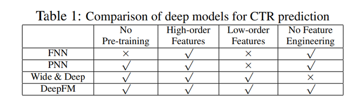 如表 1 所示,关于是否需要预训练,高阶特征,低阶特征和是否需要特征工程的比较上,列出了 DeepFM 和其他几种模型的对比。DeepFM 表现更优。