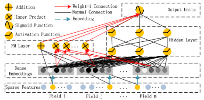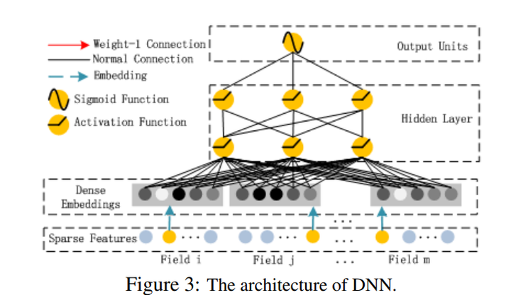 该部分和 Wide&Deep 模型类似,是简单的前馈网络。在输入特征部分,由于原始特征向量多是高纬度,高度稀疏,连续和类别混合的分域特征,因此将原始的稀疏表示特征映射为稠密的特征向量。