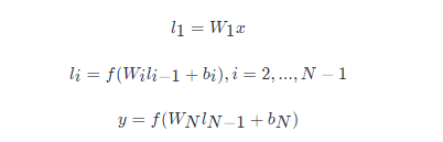 用 WiWi 表示第 i 层的权值矩阵,bibi表示第 i 层的偏置项。则第一隐层向量 l2(300 维),第 二个隐层向量 l3(300 维),输出向量 y(128 维), 用数学公式可以分别表示为: