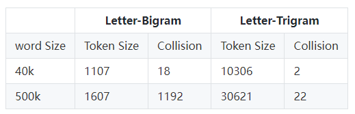 如上表,以 50 万个单词的词库为例,2 个字母的切分粒度的单词冲突为 1192(冲突的定义:至少有两个单词的 letter-bigram 向量完全相同),而 3 个字母的单词冲突降为 22 效果很好,且转化后的向量空间 3 万维不是很大,综合考虑选择 3 个字母的切分粒度。