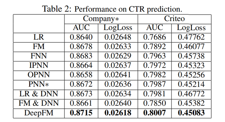 如表 2 所示,不同模型在 Company * 数据集和 Criteo 数据集上对点击率 CTR 进行预估的性能表现。DeepFM 在各个指标上表现均强于其他模型。