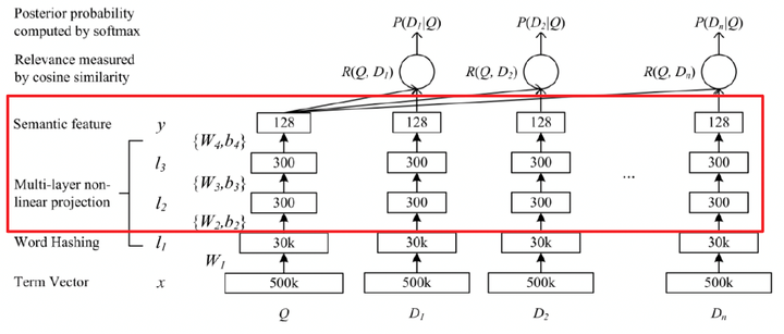 Query 和 Doc 的语义相似性可以用这两个语义向量 (128 维) 的 cosine 距离来表示: