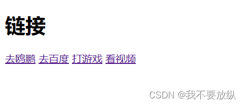 这是一个HTML页面,包含了四个链接,分别指向鸥鹏网站、百度搜索引擎、4399游戏平台和爱奇艺视频网站,用户可以点击这些链接进行浏览。