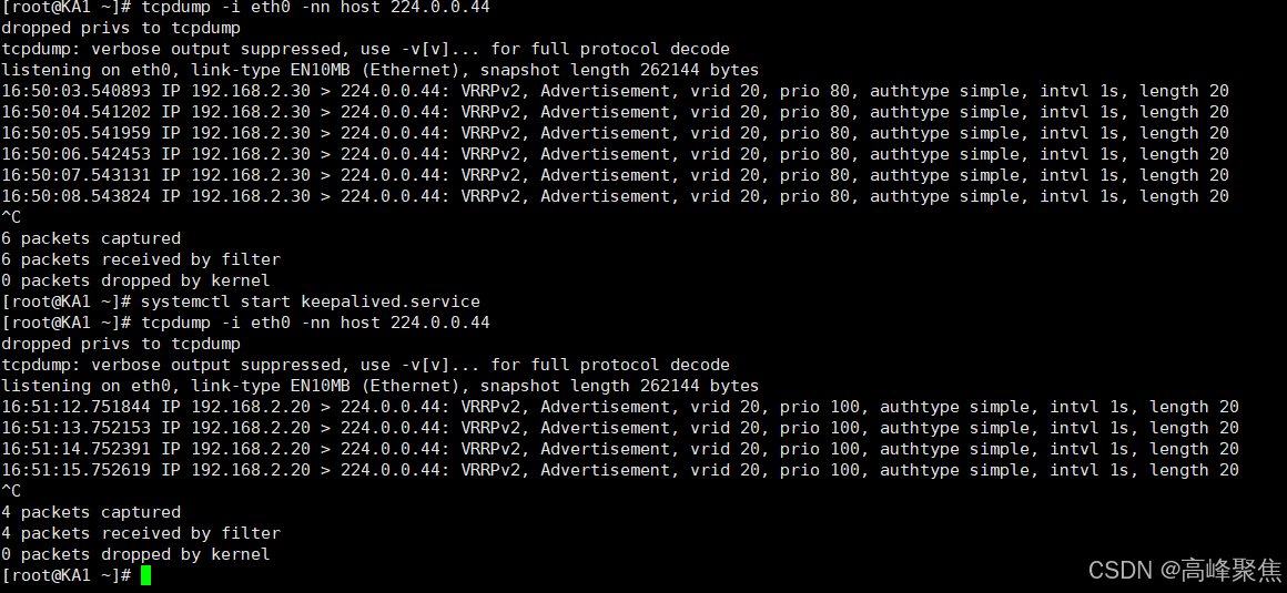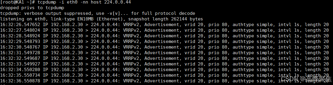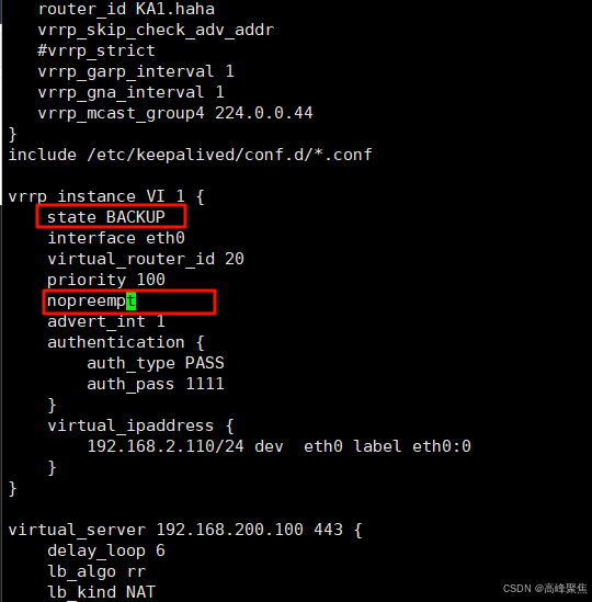 默认为抢占模式preempt,即当高优先级的主机恢复在线后,会抢占低先级的主机的master角色,这样会使vip在KA主机中来回漂移,造成网络抖动,建议设置为非抢占模式 nopreempt ,即高优先级主机恢复后,并不会抢占低优先级主机的master角色非抢占模块下,如果原主机down机, VIP迁移至的新主机, 后续也发生down时,仍会将VIP迁移回原主机
