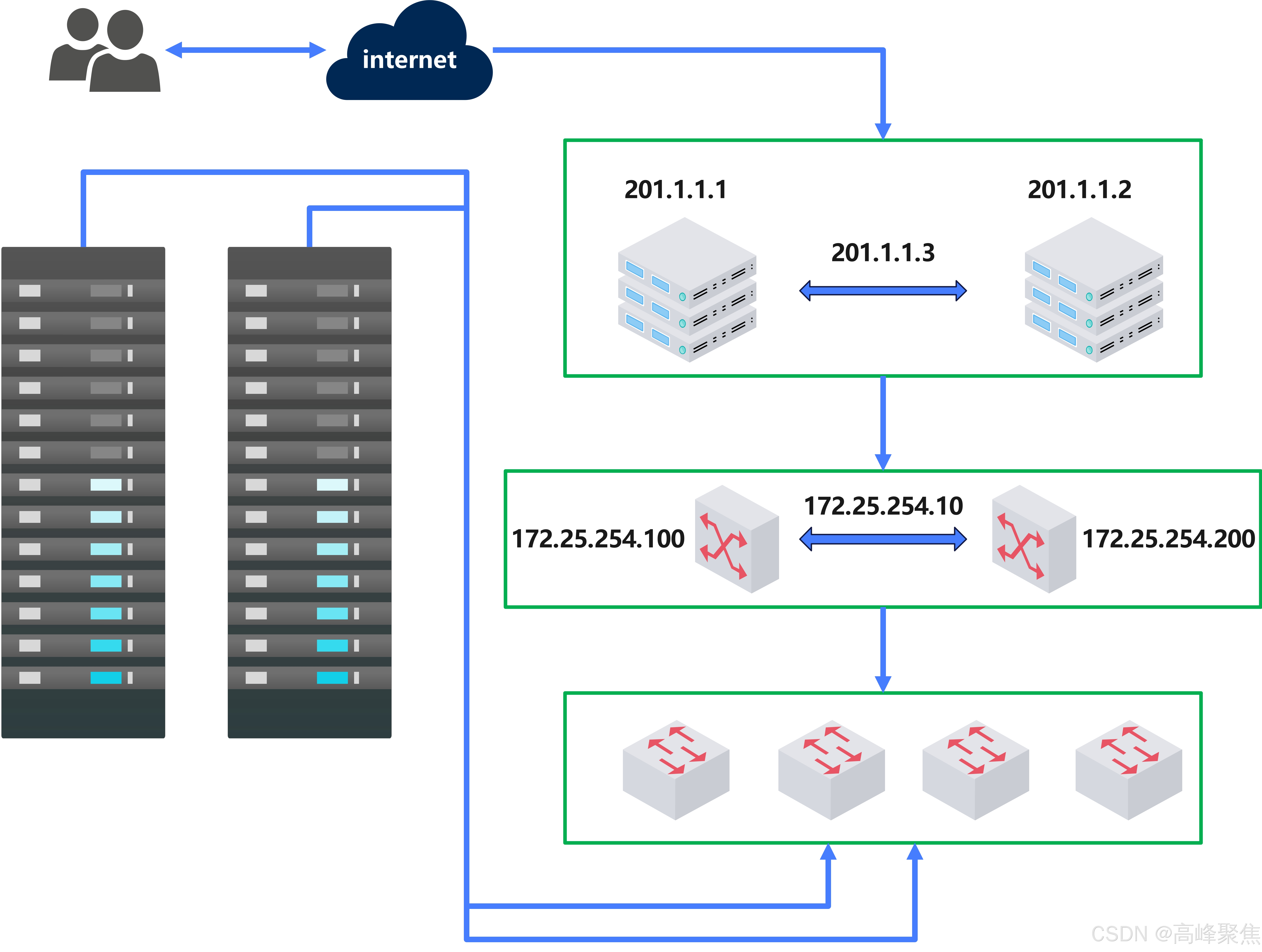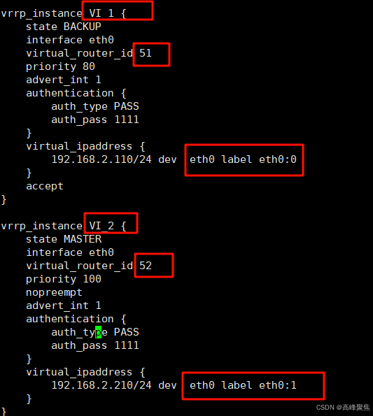 - 主/主:主/备(虚拟路由器1),备/主(虚拟路由器2)