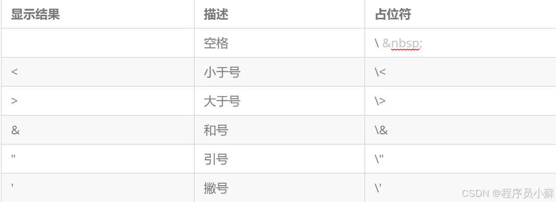 - 那在HTML中,除了空格占位符以外,还有一些其他的占位符(了解, 只需要知道空格的占位符写法即可),如下: