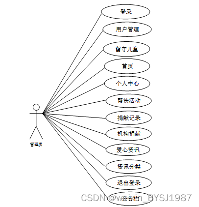 web后台管理上的管理员是维护整个社区留守儿童帮扶系统 中所有数据信息的。管理员角色用例如图2-6所示。