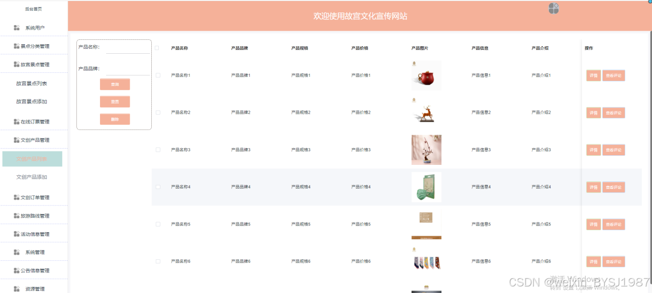 文创产品管理,在文创产品管理页面中可以对产品名称、产品类型、产品价格等信息进行详情、修改、或删除等操作,如图5-8所示。
