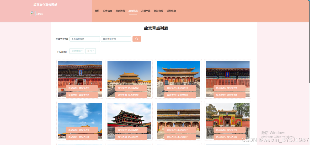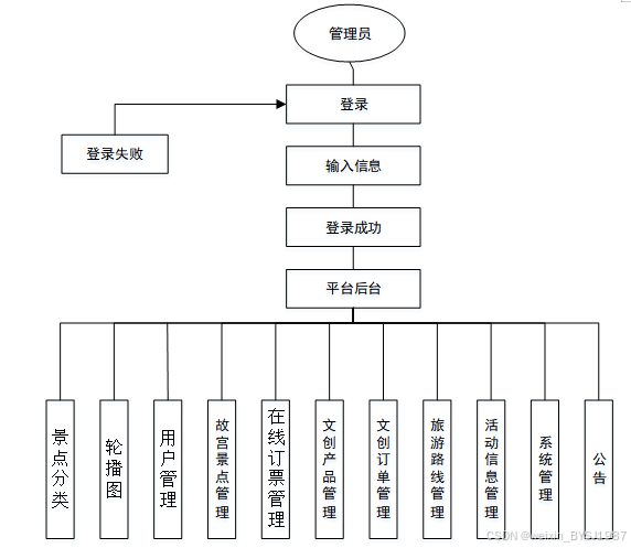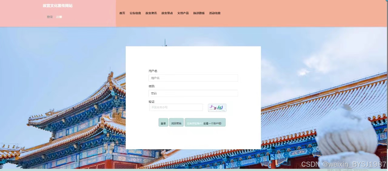 (1)功能要求:可以管理首页、公告信息、故宫资讯、故宫景点、文创产品、旅游路线等功能模块。