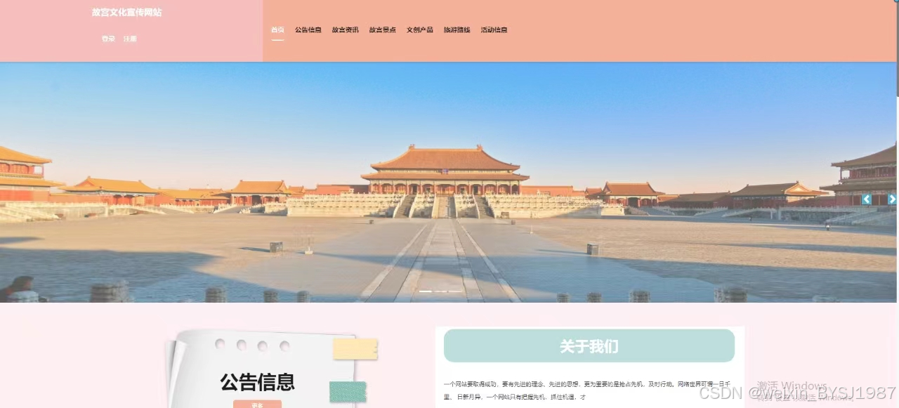 故宫文化宣传网站,在系统首页可以查看首页、公告信息、故宫资讯、故宫景点、文创产品、旅游路线、活动信息等内容,如图5-2所示。