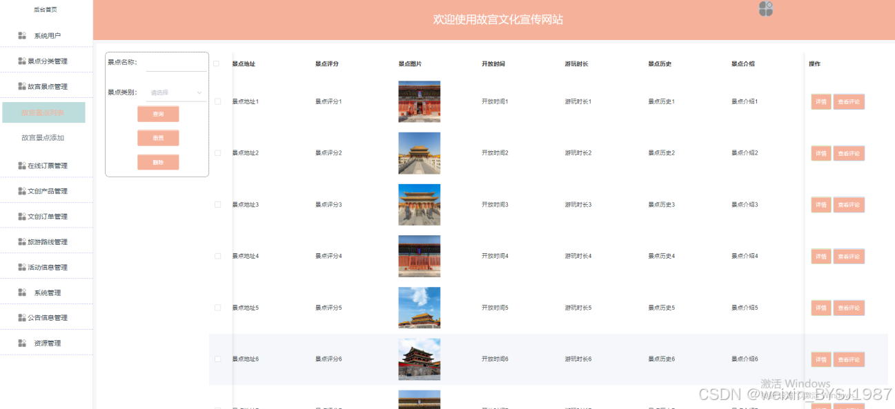 2、功能的完善性:可以管理首页、告信息、故宫资讯、故宫景点、文创产品、旅游路线等模块的修改维护操作。