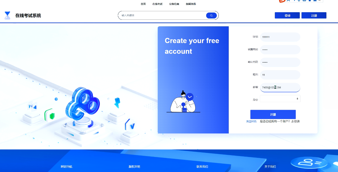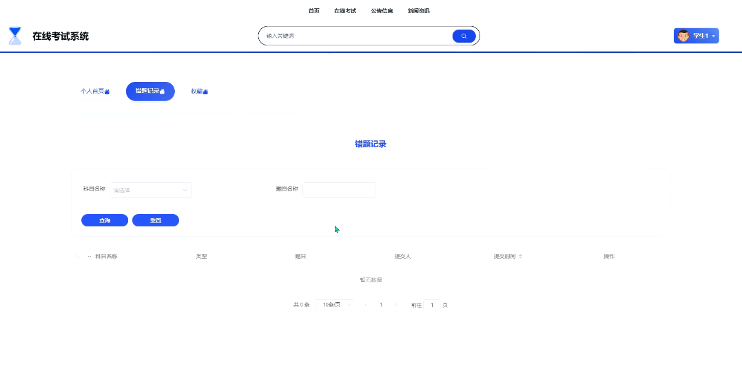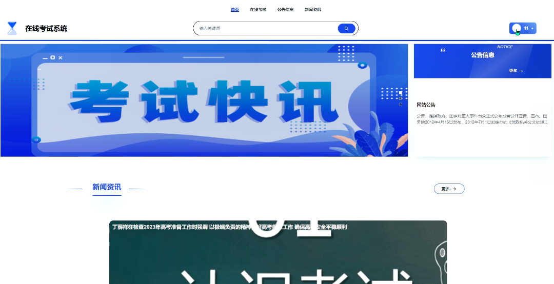 首页:在首页,学生可以查看网站的导航栏,方便快捷地跳转到各个功能模块。首页还包括轮播图、最新的考试资讯和通知公告,学生可以根据需要查看、浏览相关信息。此外,学生可以通过输入关键词进行全网搜索,快速查找所需内容,并能够修改自己的账户资料,如个人信息和密码等。
