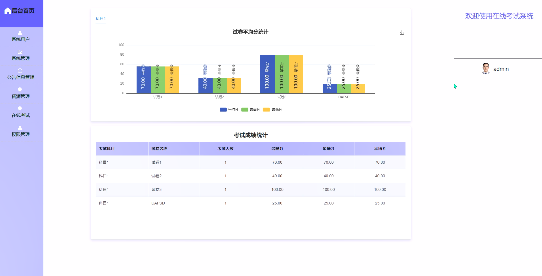 后台首页:管理员可以在后台首页查看平台的整体统计数据,包括试卷评分分数统计、考试成绩的折线图等,便于实时监控平台的运行状态。同时,管理员可以修改自己的个人资料、登录信息和密码。