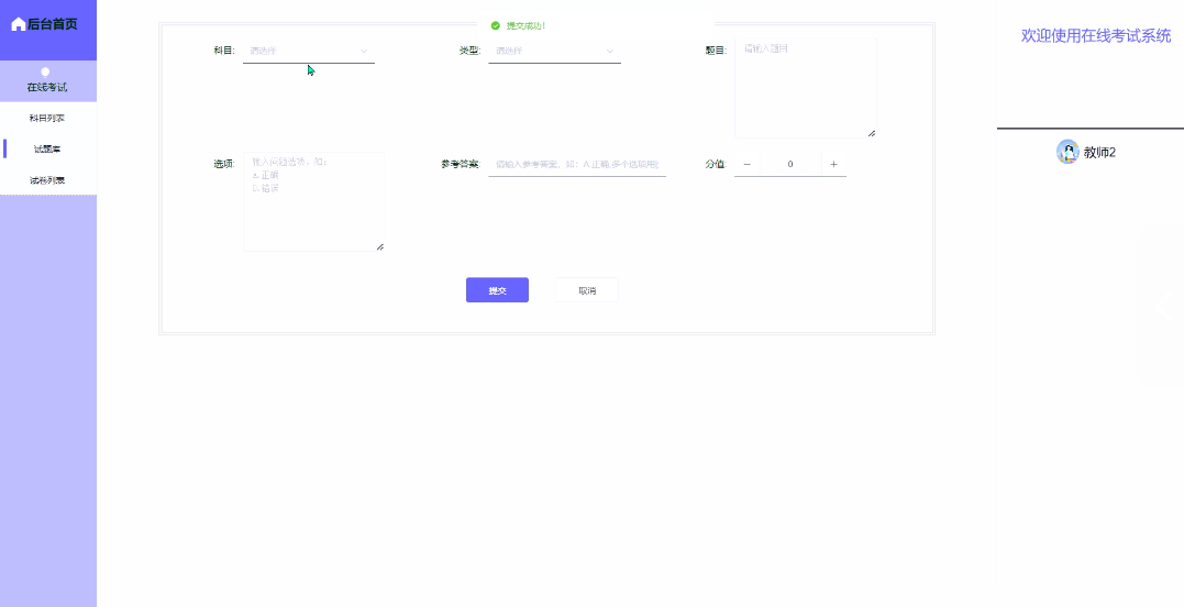 | TC003 | 验证在线考试-试题库内容输入 | 1. 进入在线考试-试题库添加界面 <br> 2. 输入正确在线考试-试题库内容和答案 <br> 3. 点击添加按钮 | 试题库内容成功录入系统 | 试题库内容成功录入系统 | 通过 |
