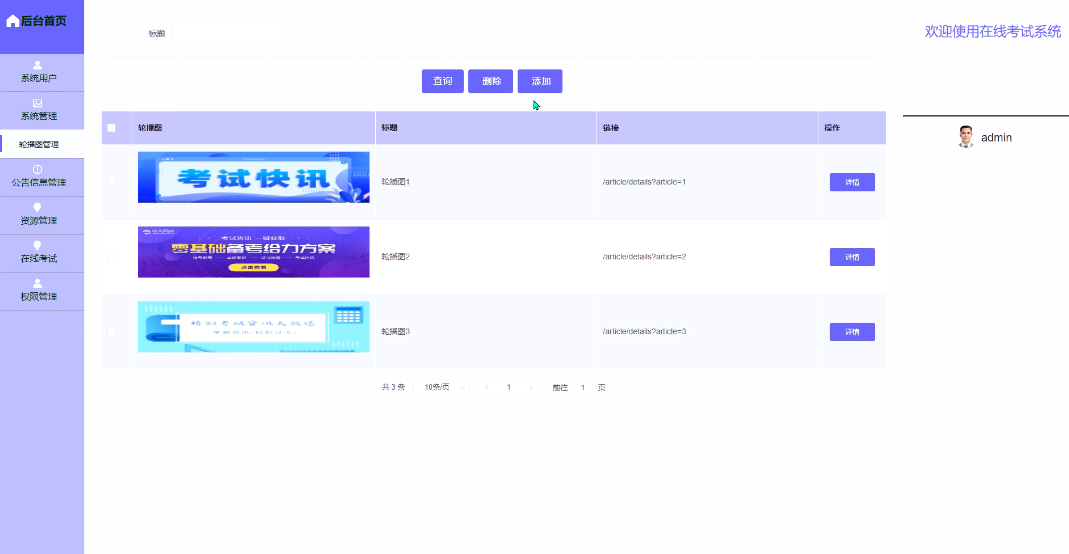 系统管理:管理员可以管理平台的轮播图,包括查看和修改各轮播图的详细信息,支持按标题进行搜索,并能进行增、删、改等操作。此外,管理员还可以管理网站的通知公告,查看公告详情并执行增删改查等功能。
