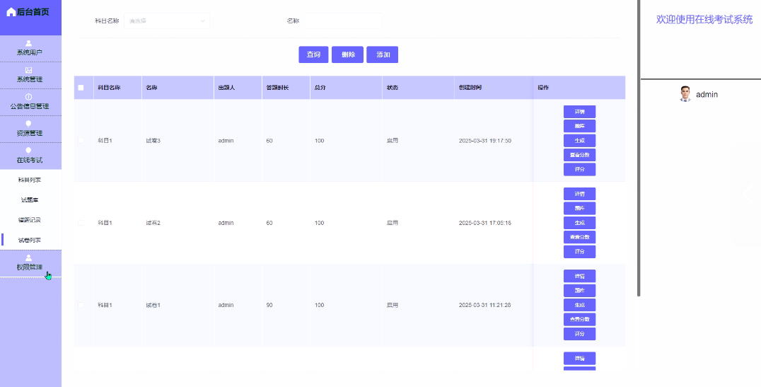 管理员可查看在线考试的各试卷列表详情,对题库生成、查看分数、评分等操作,通过输入名称、选择科目名称进行搜索,支持增删改查等操作。