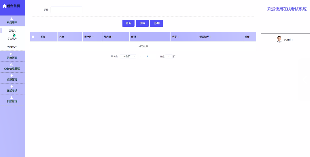 系统用户:管理员有权限管理平台上的所有用户,包括学生、教师和其他管理员。管理员可以对每个用户的账号进行查看、增删、修改、查询等操作,确保用户信息的安全性和准确性。