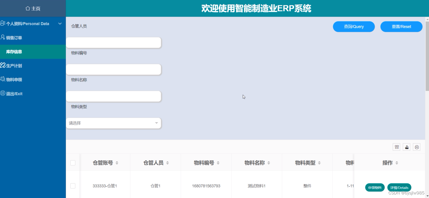 库存信息:生产用户在此页面可查看仓管账号、仓管人员、物料编号、物料名称、物料类型、物料位置、物料数量、更新日期、物料备注等详细信息,生产人员可根据需要进行详情、物料申领等操作,物料申领由仓管人员进行审核回复,如图5-15 5-16 5-17所示。