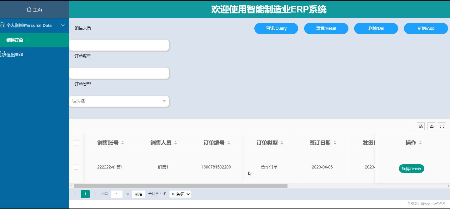销售订单,销售用户在此页面可查看销售订单信息,如:销售账号、销售人员、订单编号、订单类型、签订日期、发货日期、订单详情等详细信息,销售用户可进行新增、删除、重置或下载订单合同等操作,如图5-7所示。