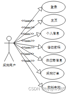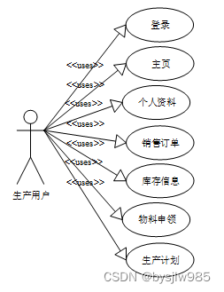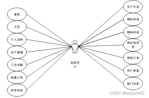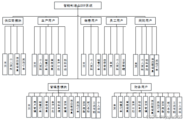 系统设计的目的是分析系统包括的所有功能结构,为开发人员设计开发和实现系统做好准备工作。经过前期的需求调查、分析和整理之后,确定的总体需求主要包括多个模块,分别是:主页、个人资料(个人信息、修改密码)用户管理(管理员、员工用户、销售用户、仓管用户、生产用户、财务用户、供应商用户)资产管理、工资管理、销售订单、库存信息、生产计划、物料申领、物料申购、供应商信息、采购订单、资产类型、部门名称。系统整体角色分为七个部分,分别是员工用户、销售用户、仓管用户、生产用户、财务用户、供应商用户最后是管理员。权限分布也是很明显,员工是在除去浏览信息之外还具有查询和管理自己账户信息权限;管理员是最高权限拥有者。