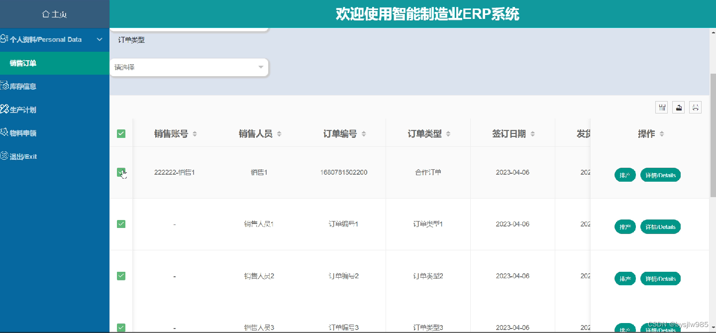 销售订单:生产用户在此页面可查看销售账号、销售人员、订单编号、订单类型、签订日期、发货日期等详细信息,生产用户可根据情况进行详情、查询和安排排产等操作,如图5-13 5-14所示。