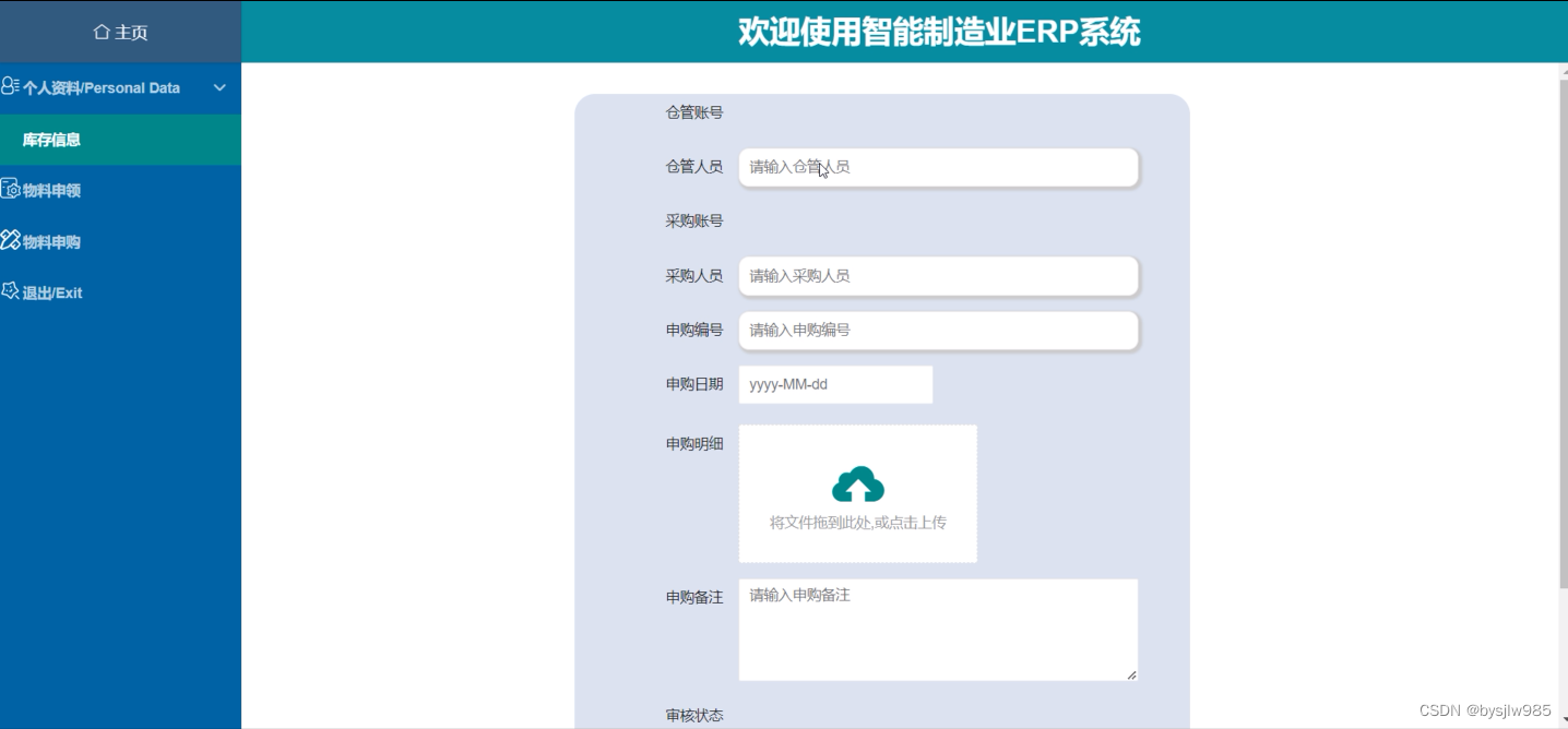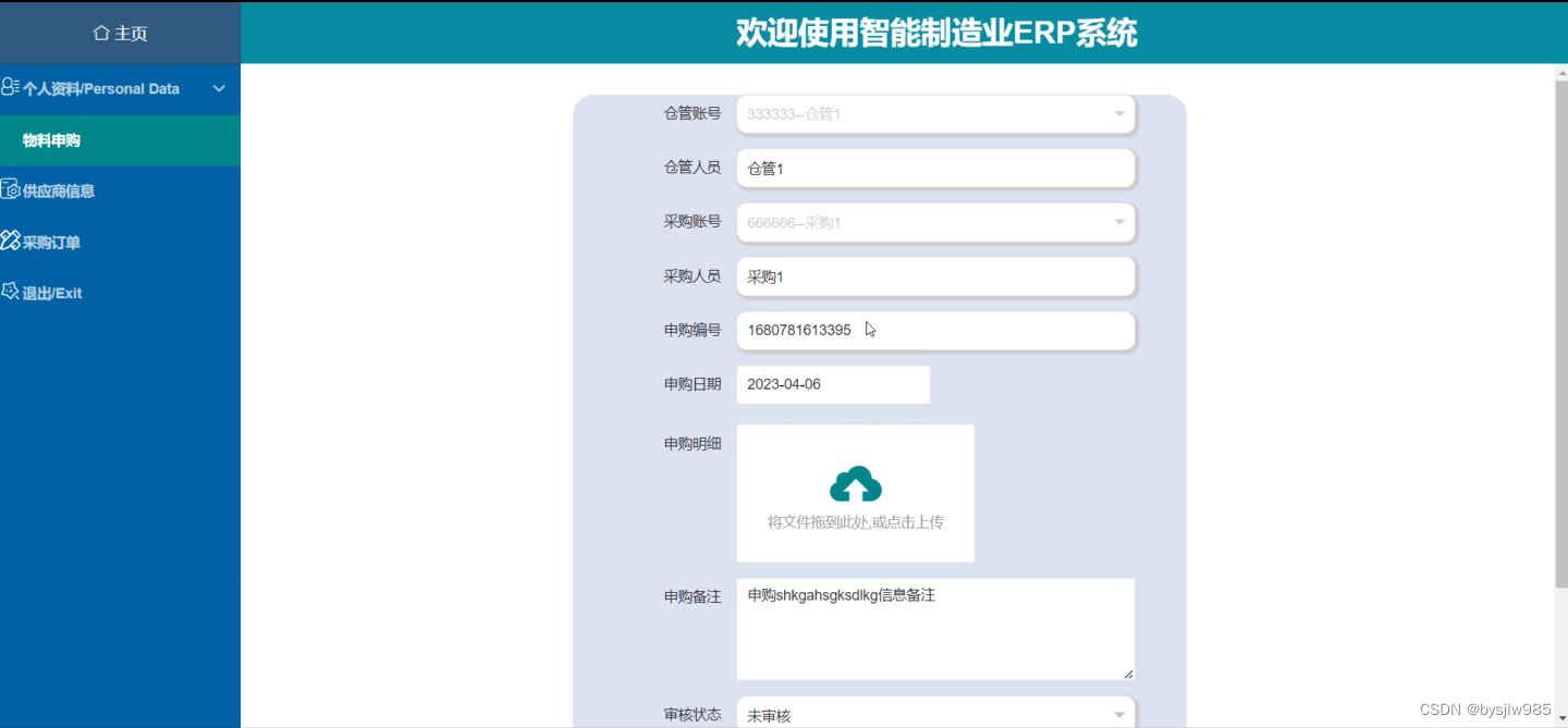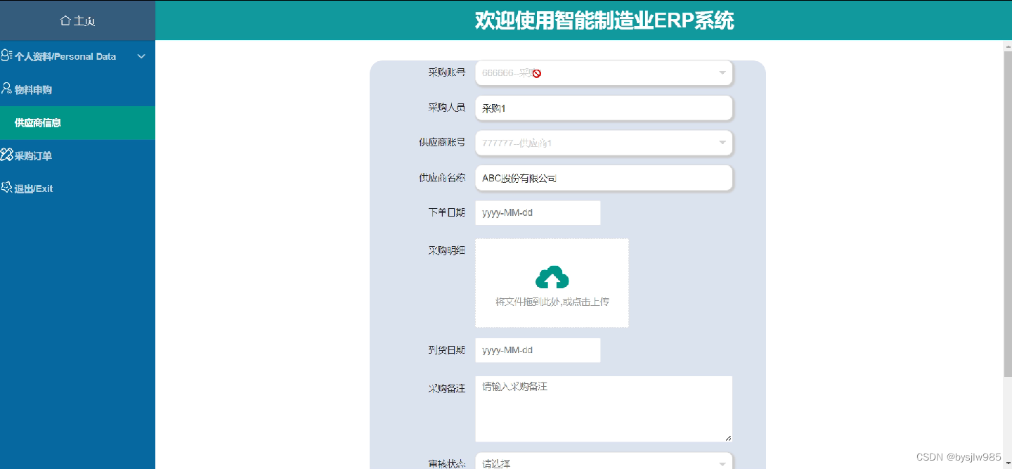 采购用户通过号、密码、滑动图片验证进行登录智能制造业ERP系统主界面,登录后可查看主页、个人资料、物料申购、供应商信息、采购订单等内容,采购用户可进行相对应操作,如图5-18所示。