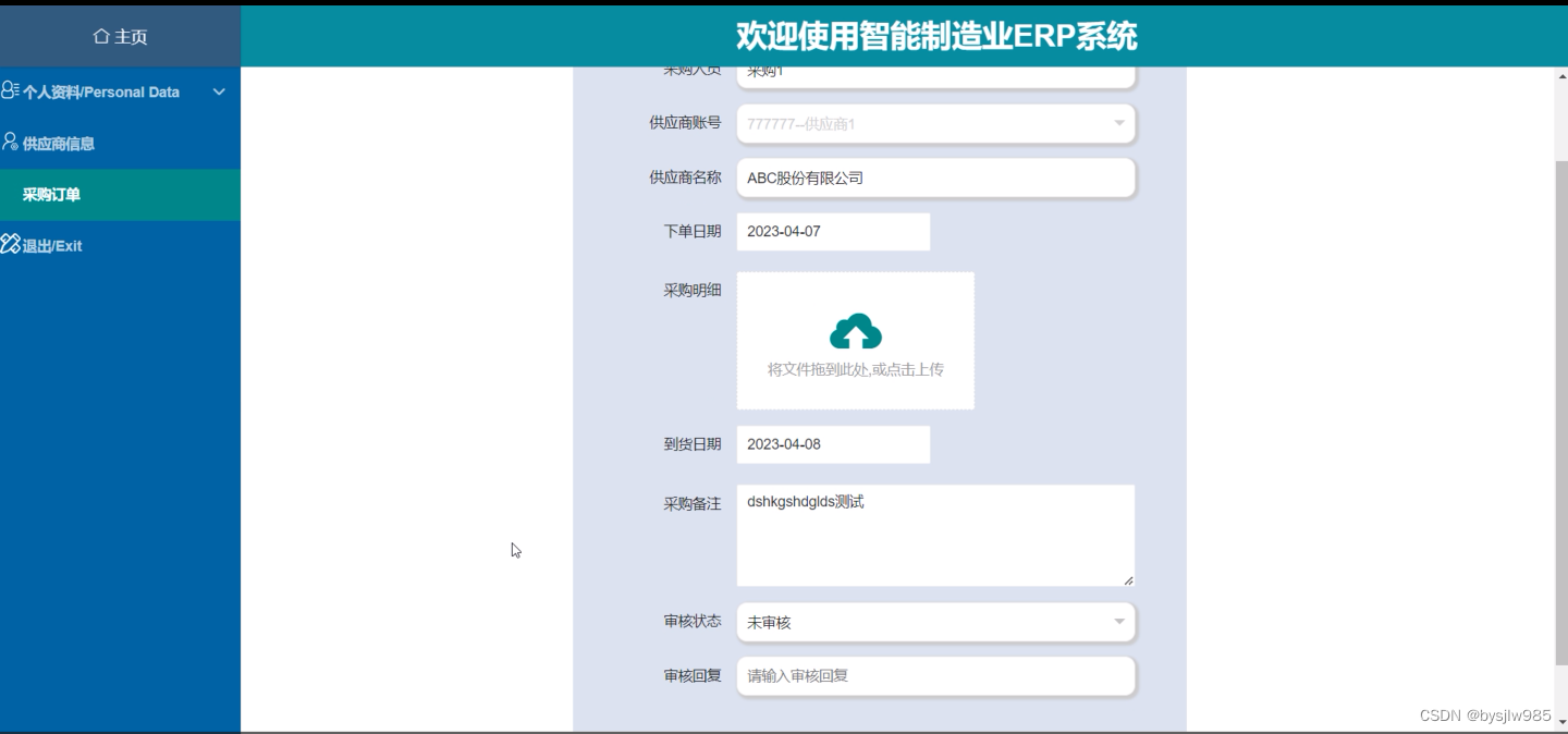 供应商用户通过号、密码、滑动图片验证进行登录智能制造业ERP系统主界面,登录后可查看主页、个人资料、供应商信息、采购订单等内容,供应商用户可进行相对应操作,如图5-21所示。