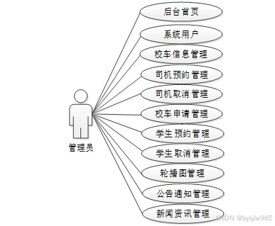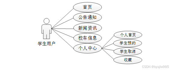 陕科大附小学生乘坐校车信息管理系统实现管理员功能包括后台首页、系统用户管理、校车信息管理、预约、取消、申请管理、轮播图、公告通知、新闻资讯管理;司机用户有个人首页、预约、取消、申请和收藏功能;学生用户可查看公告通知、新闻资讯、校车预约、个人信息,进行预约、取消和收藏操作,以提升校车服务管理和用户体验。具体功能需求分析如下: