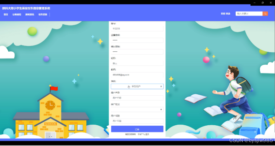 学生填写必要个人信息,创建账户并进行验证,确保信息准确性后成功注册。注册后,学生可以通过登录系统访问个人账户,浏览校车信息、预约校车、查看公告通知等功能。注册过程中,系统应提供信息验证机制,保障用户数据安全和隐私保护。注册功能的实现不仅为学生提供个性化的服务体验,也为系统管理提供了有效的用户身份识别和管理手段,促进系统的正常运行和用户参与度的提升。通过注册功能,学生可以便捷地享受校车服务管理系统提供的各项服务,提升校车出行体验和管理效率。界面展示如下图4.1所示。