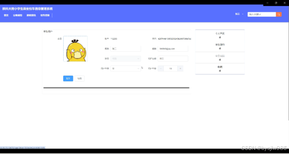 - 个人首页:展示学生用户的个人信息和预约记录,方便学生查看个人出行记录和管理个人信息。