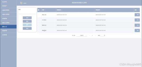 通知公告管理:管理员可以对网站公告信息进行维护管理。如图4-11所示。