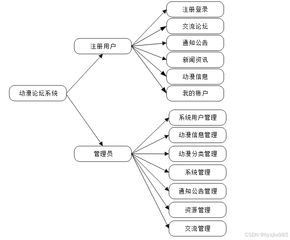 (3)确定好系统使用的技术,进行在线确认系统所划分的用户角色,并且根据用户角色划分确定所要设计的功能模块,对动漫论坛系统的设计主要划分别为管理员和用户角色,并所使用的功能模块也相应不同,但是系统的数据库实现的内容是交互的,用户可以随时根据自己的需求进行论坛交流,对于系统工作人员可以根据自己的分管内容进行在线信息的处理及操作,管理员获取到所有用户的详细数据信息,并根据需求进行第一时间处理解决。