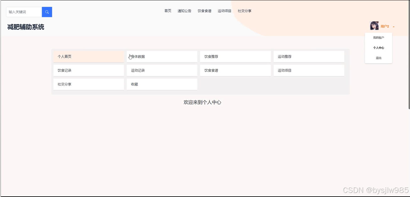 个人中心:查看个人信息如用户名、头像等,管理个人收藏的饮食食谱和运动项目,查看个人操作记录。