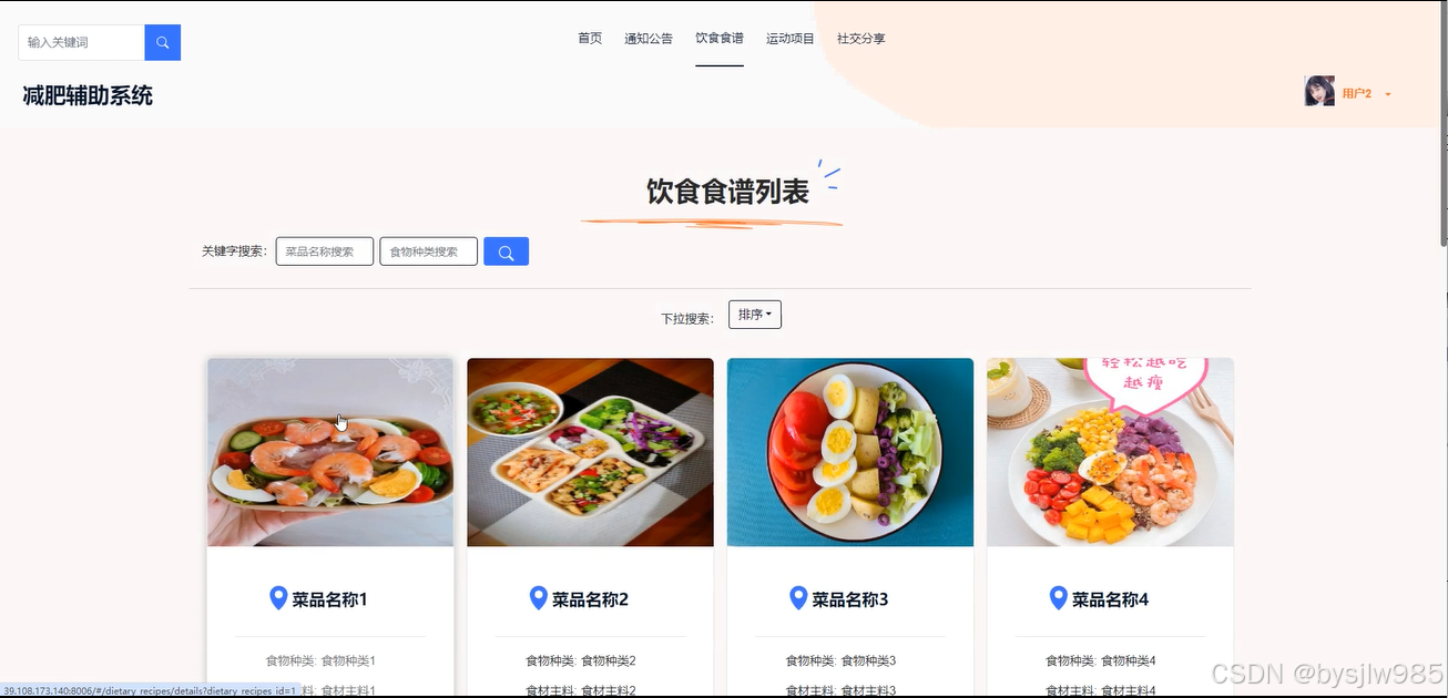 饮食食谱:用户查看饮食食谱列表的所有信息,包括食物种类、食材主料等。输入关键字进行下拉搜索。用户对喜欢的食谱进行点赞、收藏和发表评论并可查看饮食视频。界面如下图所示。