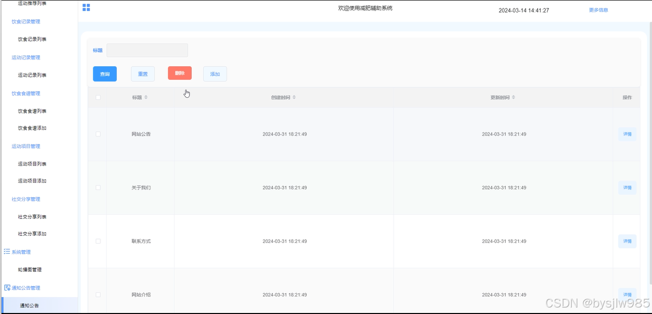 运动推荐管理:管理员可以管理用户的运动推荐内容详情,包括查看列表、查询、重置、删除、查看详情,管理用户的运动记录。