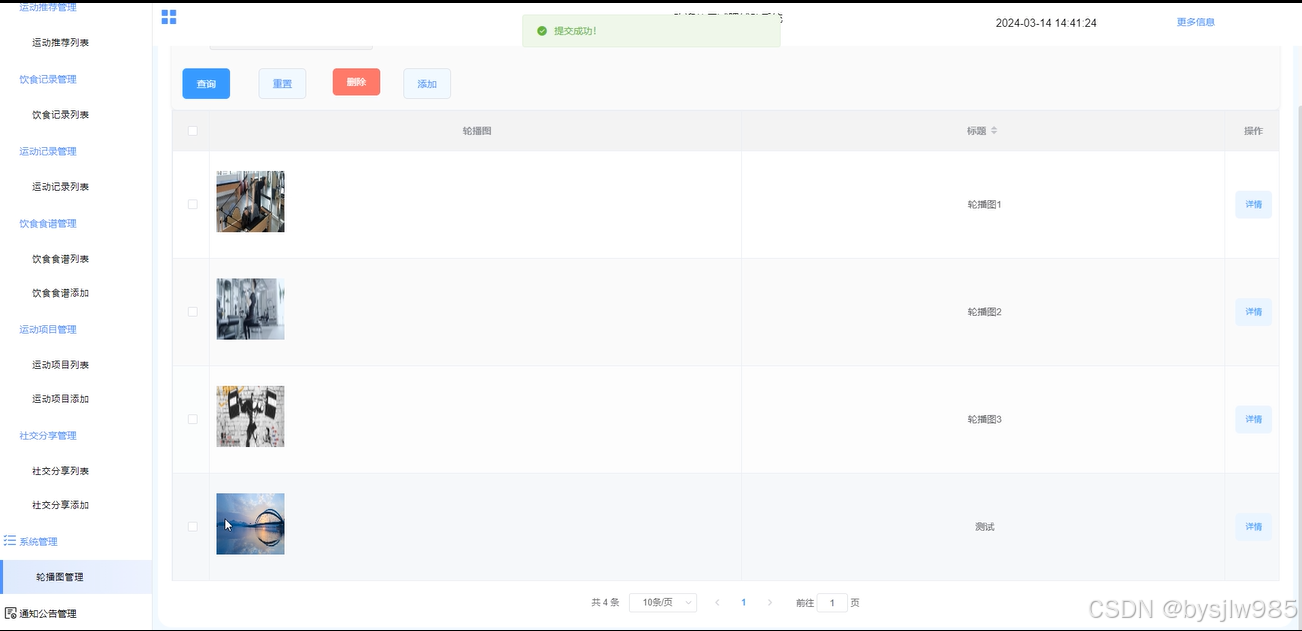 系统管理:管理员可以对系统前台展示的轮播图进行增删改查,方便用户进行查看。界面如下图所示。