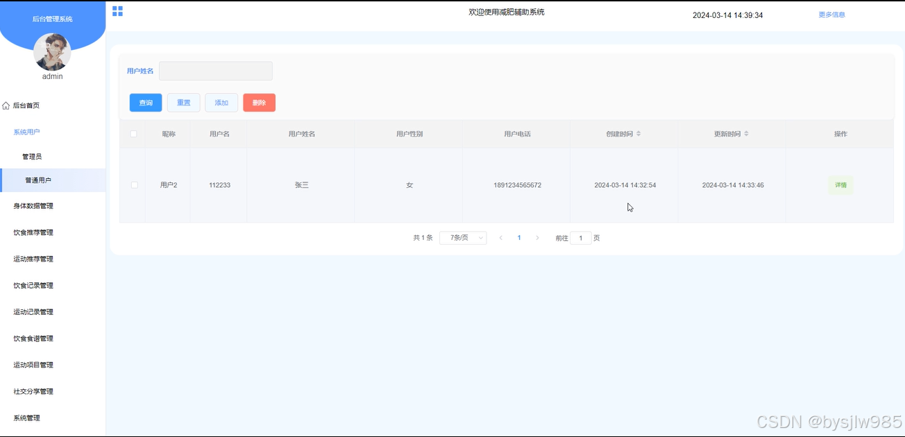 身体数据管理:管理员可以管理用户的身体数据详情,包括查看列表、添加新数据、查询、重置、删除、查看详情,可管理用户的饮食推荐和运动推荐。