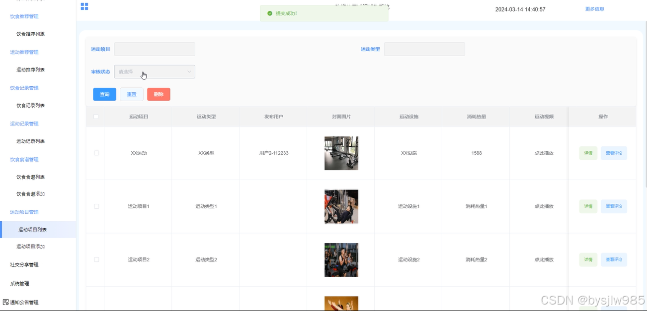 运动项目管理:管理员可以管理用户的运动项目内容详情,包括查看列表、添加新项目、查询、重置、删除、查看详情、查看评论并进行审核。
