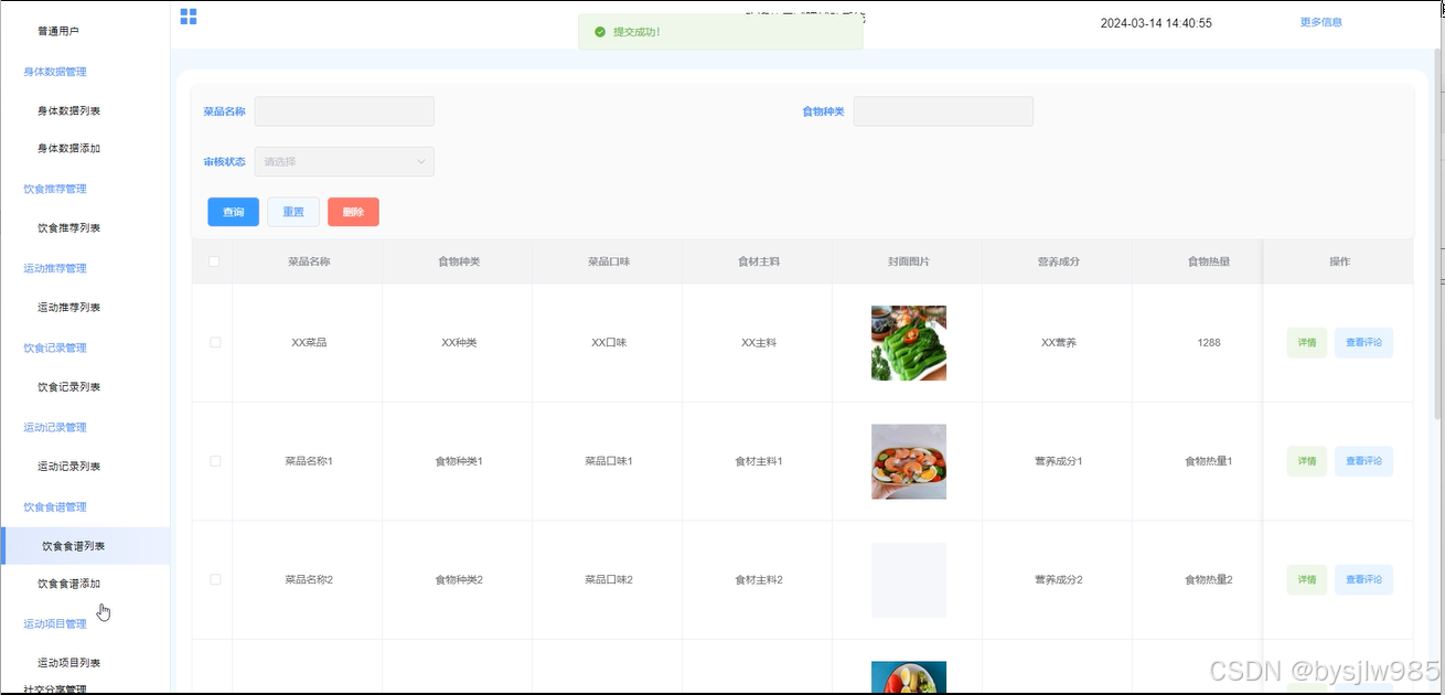 饮食食谱管理:管理员可以管理用户的饮食食谱内容详情,包括查看列表、添加新食谱、查询、重置、删除、查看详情、查看用户评论并进行审核。