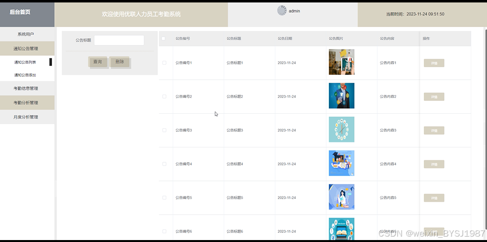 点击“通知公告管理”这个菜单,可以对系统中的通知和公告进行管理,包括通知和公告的编辑、删除等操作。通知公告管理界面如下图所示。