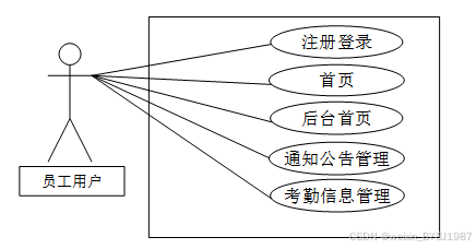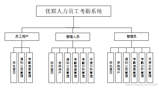 基于Spring Boot的优联人力员工考勤系统可以划分为员工用户模块、管理人员模块和系统管理员模块这三个部分,以满足不同角色的需求。员工用户模块用于员工查看和管理个人考勤记录、申请假期等;管理人员模块用于管理人员审批假期申请、生成报表等;系统管理员模块用于系统的设置、用户管理等。具体功能需求如下: