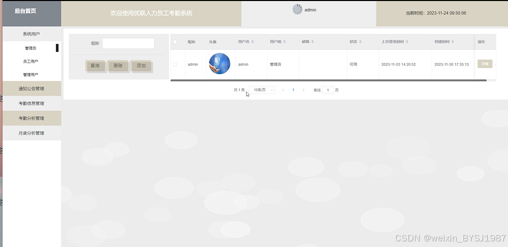 管理员可以对系统中所有的用户角色进行管控,包含了管理员、员工用户、管理用户三种角色,如果需要添加新的用户,点击页面中的“添加”按钮根据提示输入上用户信息,点击“提交”以后在对应的用户界面就可以查看到了,可以点击用户后面的“删除”按钮直接删除某一用户。界面如下图所示。