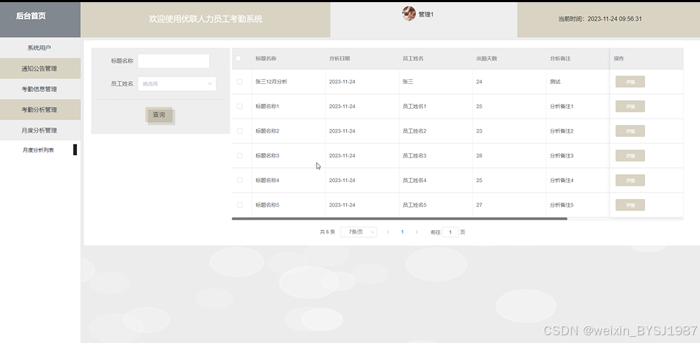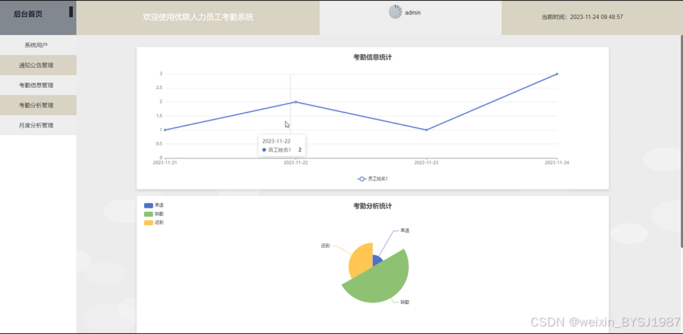 月度分析管理: 管理员可以查看和分析每个月的考勤情况,包括出勤率、迟到早退次数、加班时长等指标。
