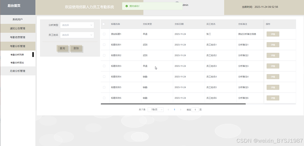 管理员和管理人员点击“考勤分析管理”这一菜单会显示考勤分析列表、考勤分析添加这两个子菜单,支持输入关键词对考勤分析信息进行查询,如果想要添加新的考勤分析信息,点击“添加”按钮,输入相关信息,点击“提交”按钮就可以添加了,同时可以选择某一条考勤分析信息,点击“删除”进行删除。界面如下图所示。